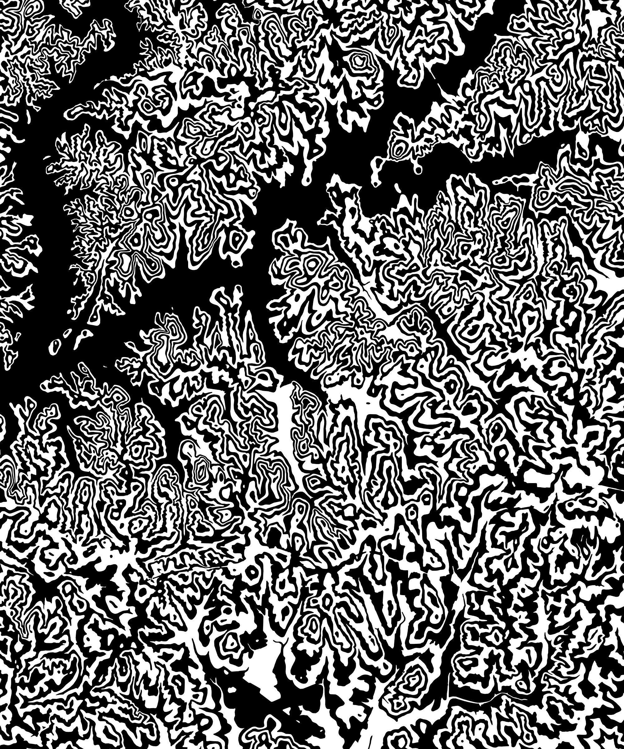 Contour lines on a topographic map are imaginary lines connecting points on the map that have the same elevation on the surface of the land above or below mean sea level. These found abstractions taken from the US Geological Survey's 7½ Minute Series reveal natural and man-made shapes and patterns of each landscape at the time each map was drawn. I begin in the top left corner with black and alternate black and white, filling in the space between the contour lines, until I reach the lower right corner. The titles are taken directly from the maps themselves.