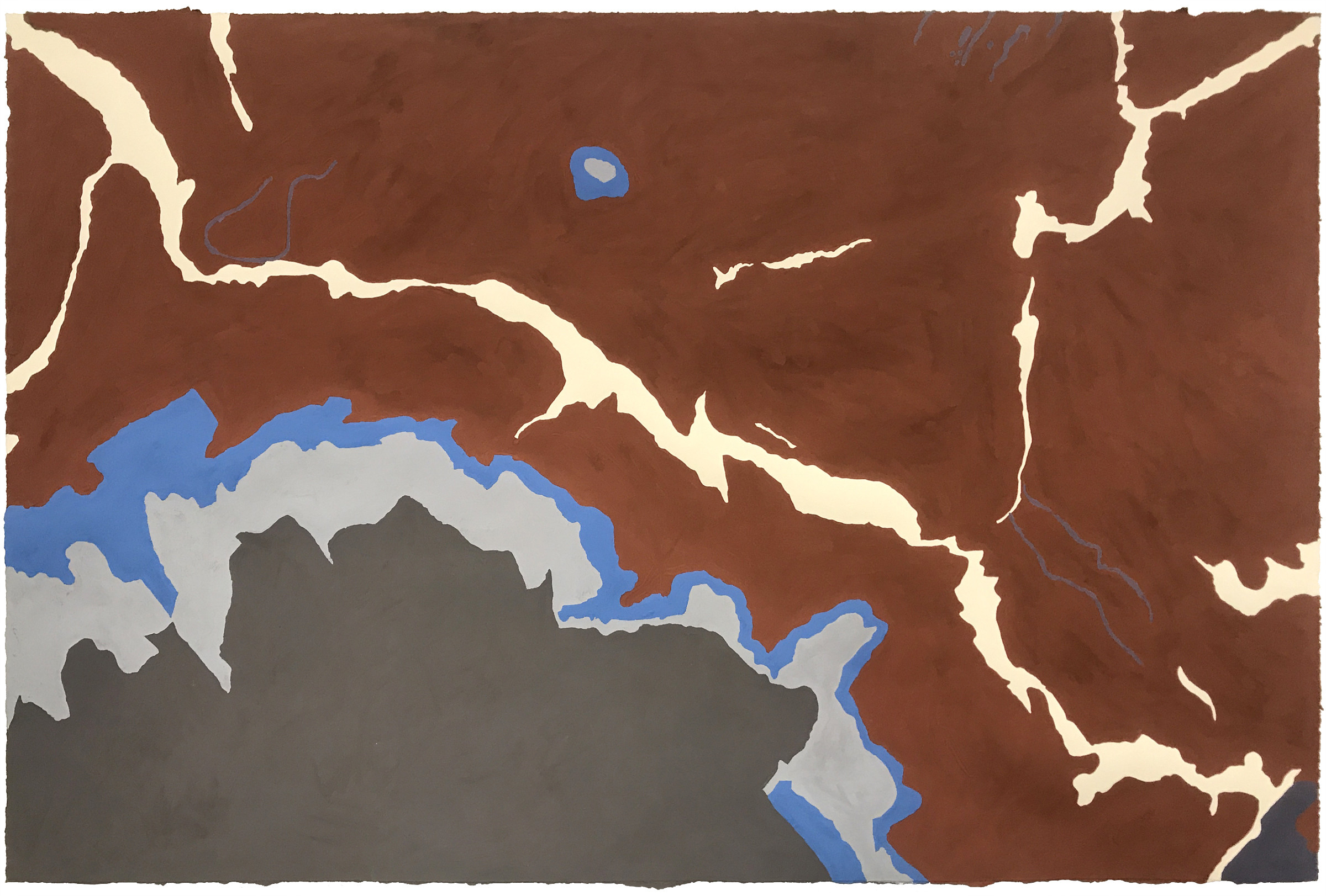 In the Geologic Abstractions series I downloaded images from the Internet of vintage hand-watercolored geologic maps from the 19th and early 20th centuries. Using the colors from the maps themselves and deleting all other information in the maps these painting-like abstractions were revealed. The titles are taken directly from the maps and offer the only hint at the actual location in the maps. These found two-dimensional representations of three-dimensional space are rectified readymades and are snapshots of geologic time.