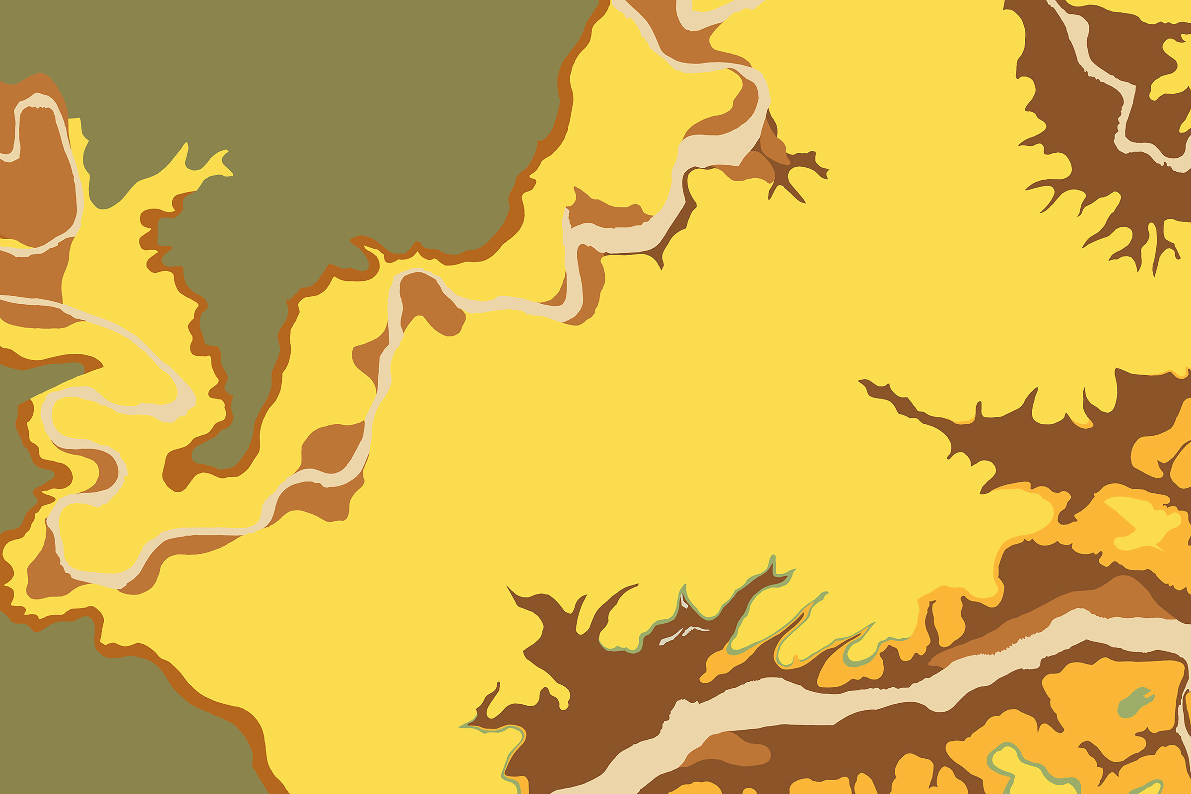In the Geologic Abstractions series I downloaded images from the Internet of vintage hand-watercolored geologic maps from the 19th and early 20th centuries. Using the colors from the maps themselves and deleting all other information in the maps these painting-like abstractions were revealed. The titles are taken directly from the maps and offer the only hint at the actual location in the maps. These found two-dimensional representations of three-dimensional space are rectified readymades and are snapshots of geologic time.