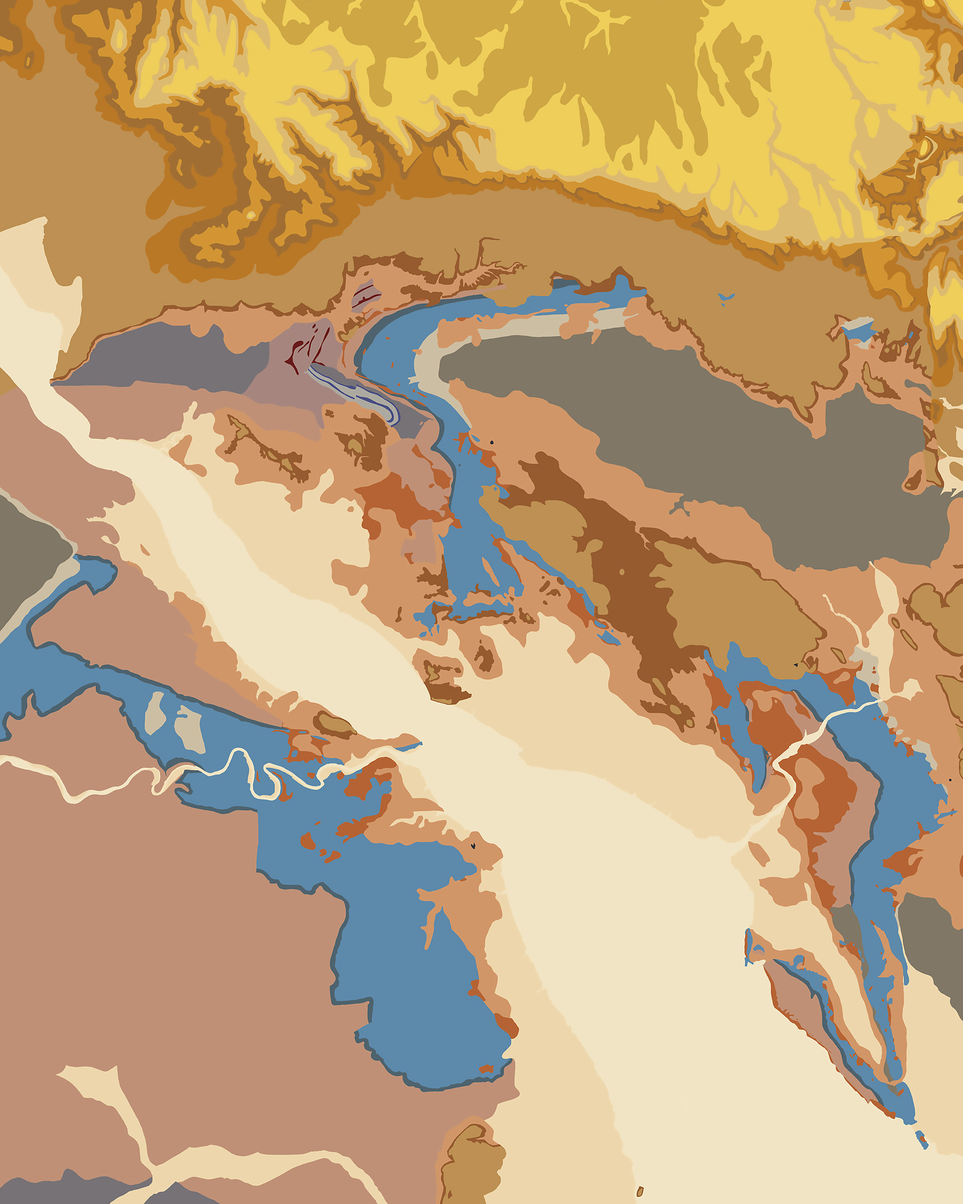 In the Geologic Abstractions series I downloaded images from the Internet of vintage hand-watercolored geologic maps from the 19th and early 20th centuries. Using the colors from the maps themselves and deleting all other information in the maps these painting-like abstractions were revealed. The titles are taken directly from the maps and offer the only hint at the actual location in the maps. These found two-dimensional representations of three-dimensional space are rectified readymades and are snapshots of geologic time.