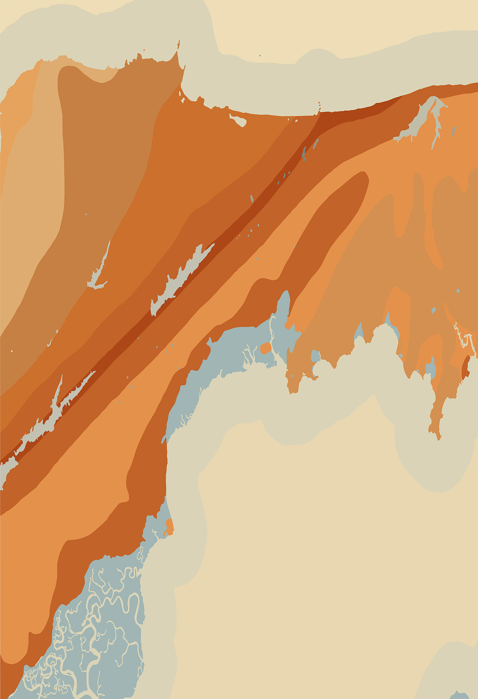 In the Geologic Abstractions series I downloaded from the Internet images of historical maps from the 19th and early 20th centuries of geologic structures of the given area of land. Using the colors from the maps themselves and deleting all other information in the maps these painting-like abstractions were revealed. The titles are taken directly from the maps and offer the only hint at the actual location in the maps.