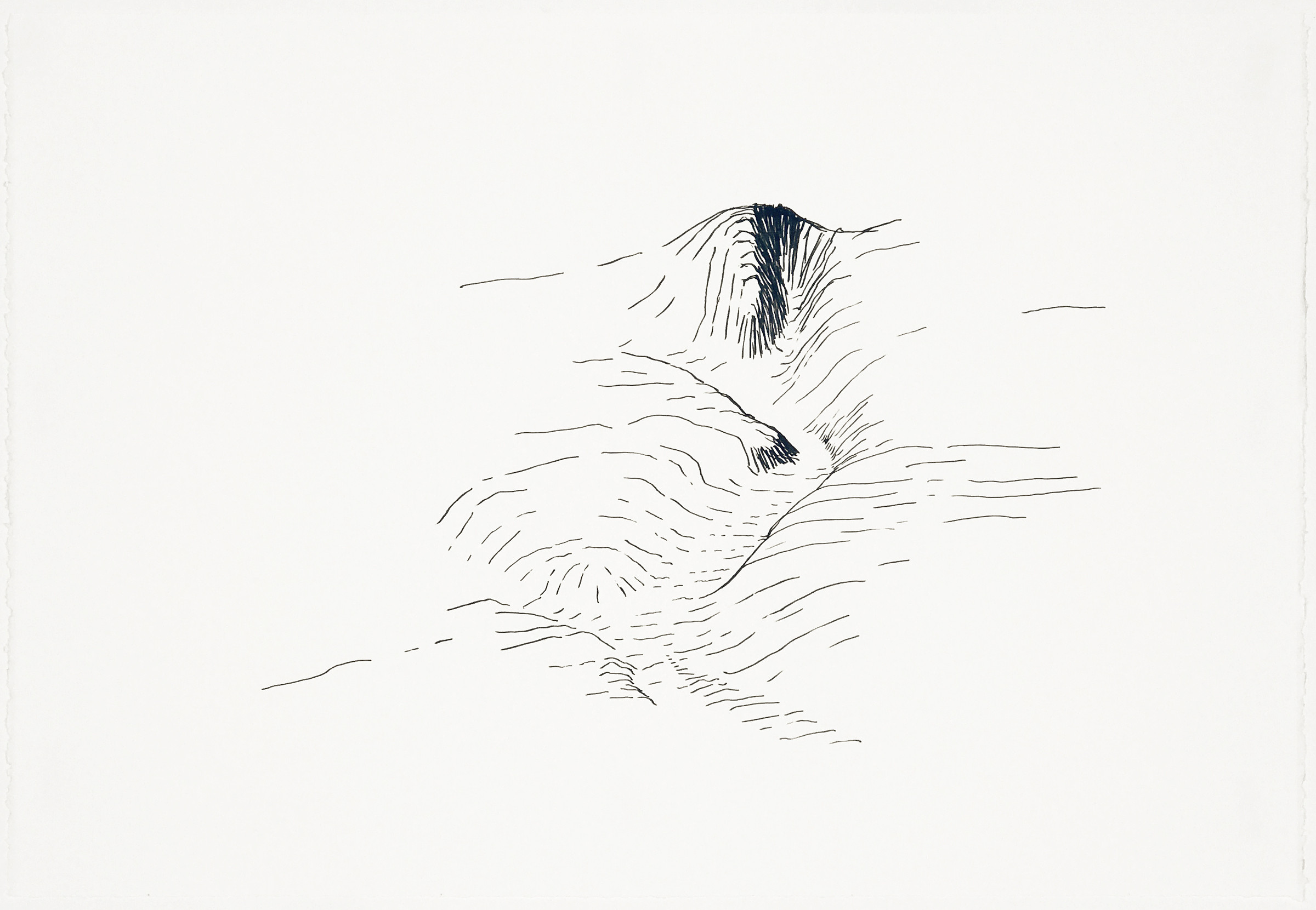The Oblique Ontological Terrain series developed out an oblique map atlas I found on-line published by the USGS in the 1970s. I redrew and enlarged sections of these maps by hand (pen and ink) while looking at them on my iPad. The word oblique means neither perpendicular nor parallel or not straightforward, indirect, obscure, devious or underhanded. Ontology is the half of metaphysics that studies the origins, history and essence of being. And, terrain means a geographic area or the physical features of a tract of land, but, also, a field of knowledge or interest. The definitions of the words in the title and the undulating mountains seemed to intersect perfectly with the isolation of Covid-19 lock-downs and tumultuous social upheaval of our time.