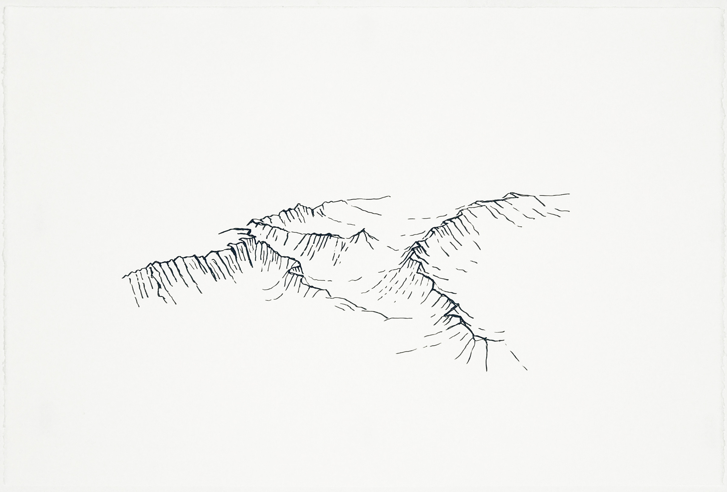 The Oblique Ontological Terrain series developed out an oblique map atlas I found on-line published by the USGS in the 1970s. I redrew and enlarged sections of these maps by hand (pen and ink) while looking at them on my iPad. The word oblique means neither perpendicular nor parallel or not straightforward, indirect, obscure, devious or underhanded. Ontology is the half of metaphysics that studies the origins, history and essence of being. And, terrain means a geographic area or the physical features of a tract of land, but, also, a field of knowledge or interest. The definitions of the words in the title and the undulating mountains seemed to intersect perfectly with the isolation of Covid-19 lock-downs and tumultuous social upheaval of our time.