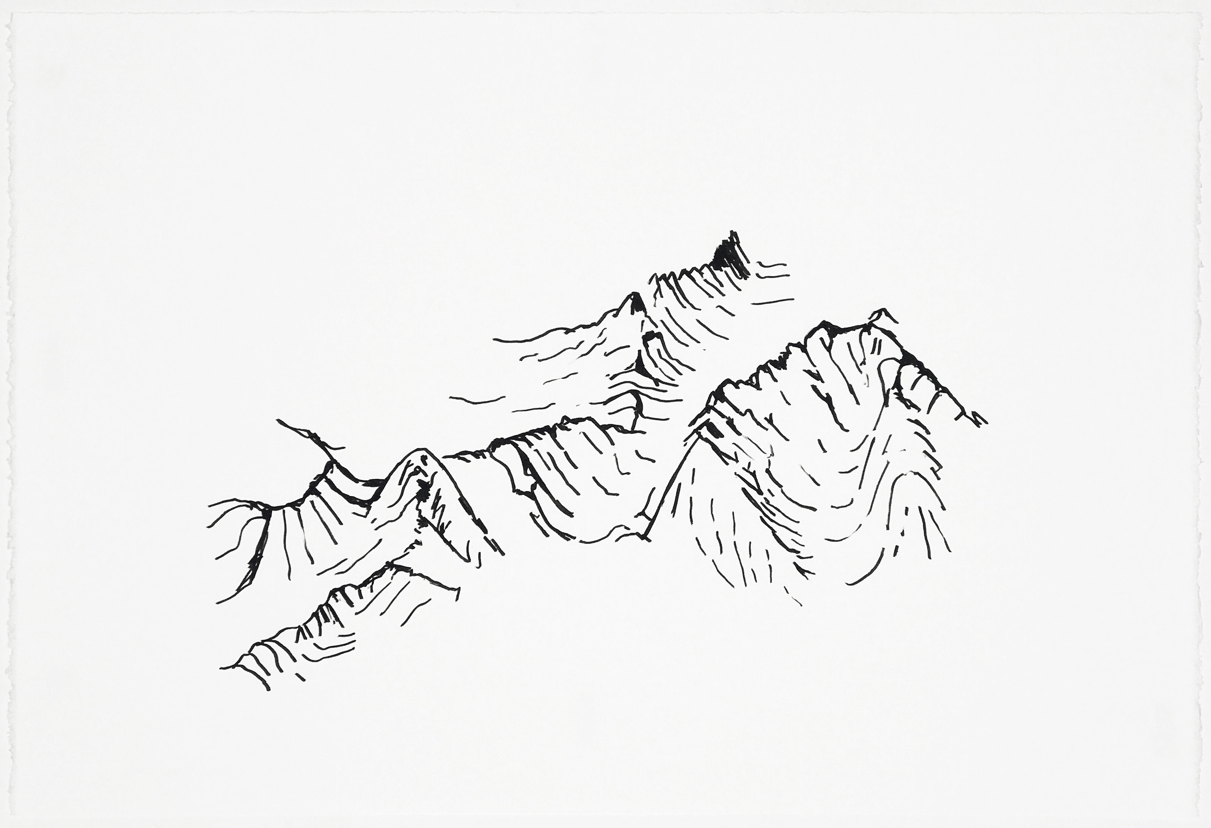 The Oblique Ontological Terrain series developed out an oblique map atlas I found on-line published by the USGS in the 1970s. I redrew and enlarged sections of these maps by hand (pen and ink) while looking at them on my iPad. The word oblique means neither perpendicular nor parallel or not straightforward, indirect, obscure, devious or underhanded. Ontology is the half of metaphysics that studies the origins, history and essence of being. And, terrain means a geographic area or the physical features of a tract of land, but, also, a field of knowledge or interest. The definitions of the words in the title and the undulating mountains seemed to intersect perfectly with the isolation of Covid-19 lock-downs and tumultuous social upheaval of our time.