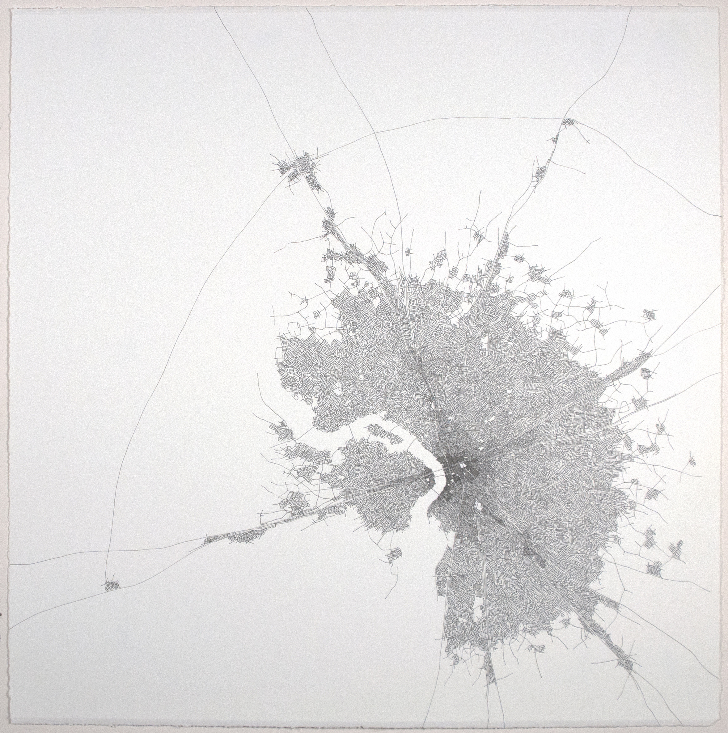Ontology is a central theme throughout my work because it deals with the nature of existence or being by analyzing concepts about location, time, space, and identity. Geology, geography and especially cartography provide me with useful languages to manipulate and transform these ontological concepts into visual metaphors. These metaphors are often used to convey ideas, feelings or emotions about a place, process, movement, perception or state of being. Each Ontological Road Map is not only a finished work that represents a fictional place, but it is also a reflection of the hand of the artist, the act of making lines. Each of these drawings involves a labor-intensive process where much time is needed for construction and development. Once the drawing is complete, it is a picture of time. That is, each drawing reveals the time it takes to make a road map and then each finished drawing actually represents that time. All along, there is a literal play on mapping. Each drawing represents a process (of mapmaking, of creating roads) and a place (a representation of existence that can be either real or imagined).