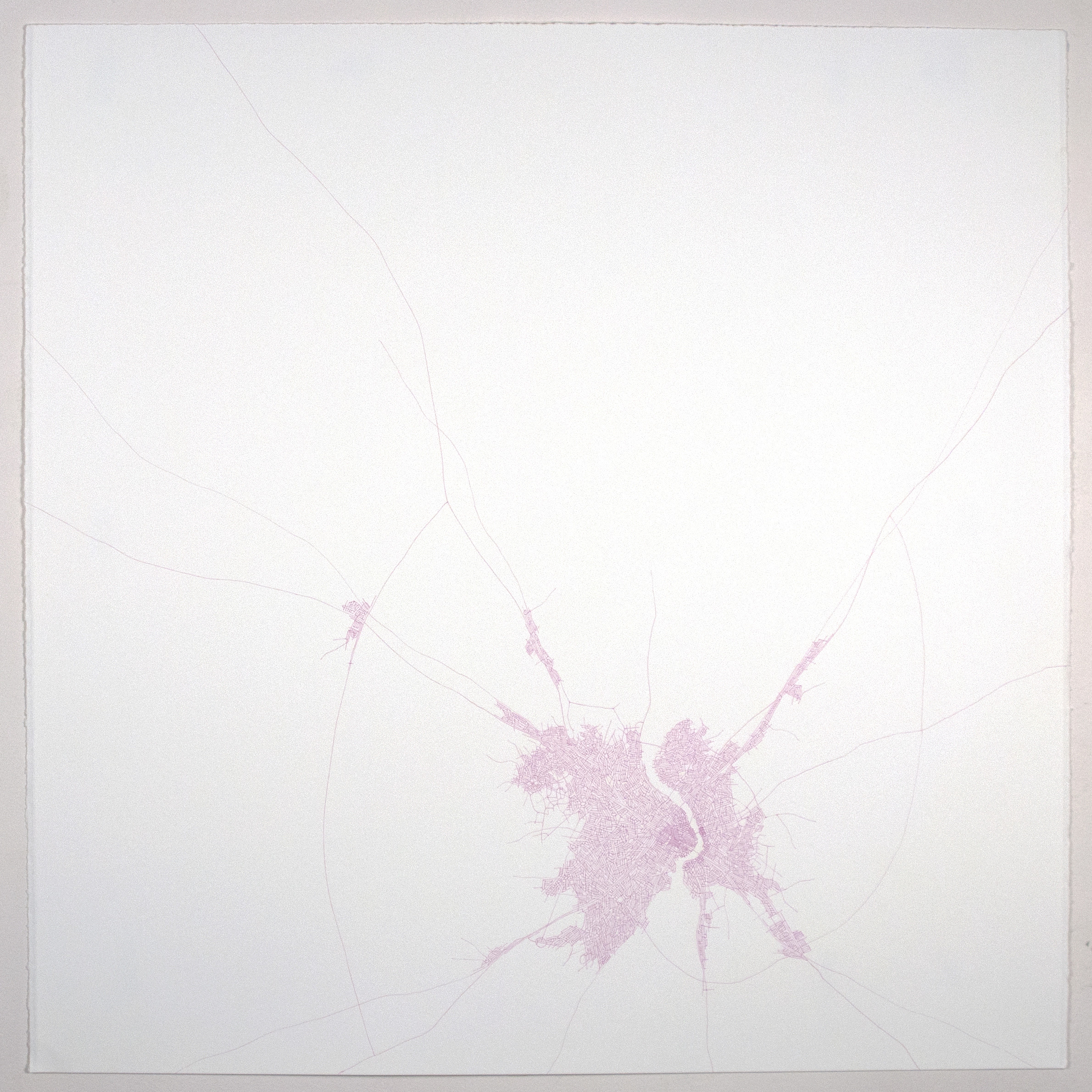 Ontology is a central theme throughout my work because it deals with the nature of existence or being by analyzing concepts about location, time, space, and identity. Geology, geography and especially cartography provide me with useful languages to manipulate and transform these ontological concepts into visual metaphors. These metaphors are often used to convey ideas, feelings or emotions about a place, process, movement, perception or state of being. Each Ontological Road Map is not only a finished work that represents a fictional place, but it is also a reflection of the hand of the artist, the act of making lines. Each of these drawings involves a labor-intensive process where much time is needed for construction and development. Once the drawing is complete, it is a picture of time. That is, each drawing reveals the time it takes to make a road map and then each finished drawing actually represents that time. All along, there is a literal play on mapping. Each drawing represents a process (of mapmaking, of creating roads) and a place (a representation of existence that can be either real or imagined).