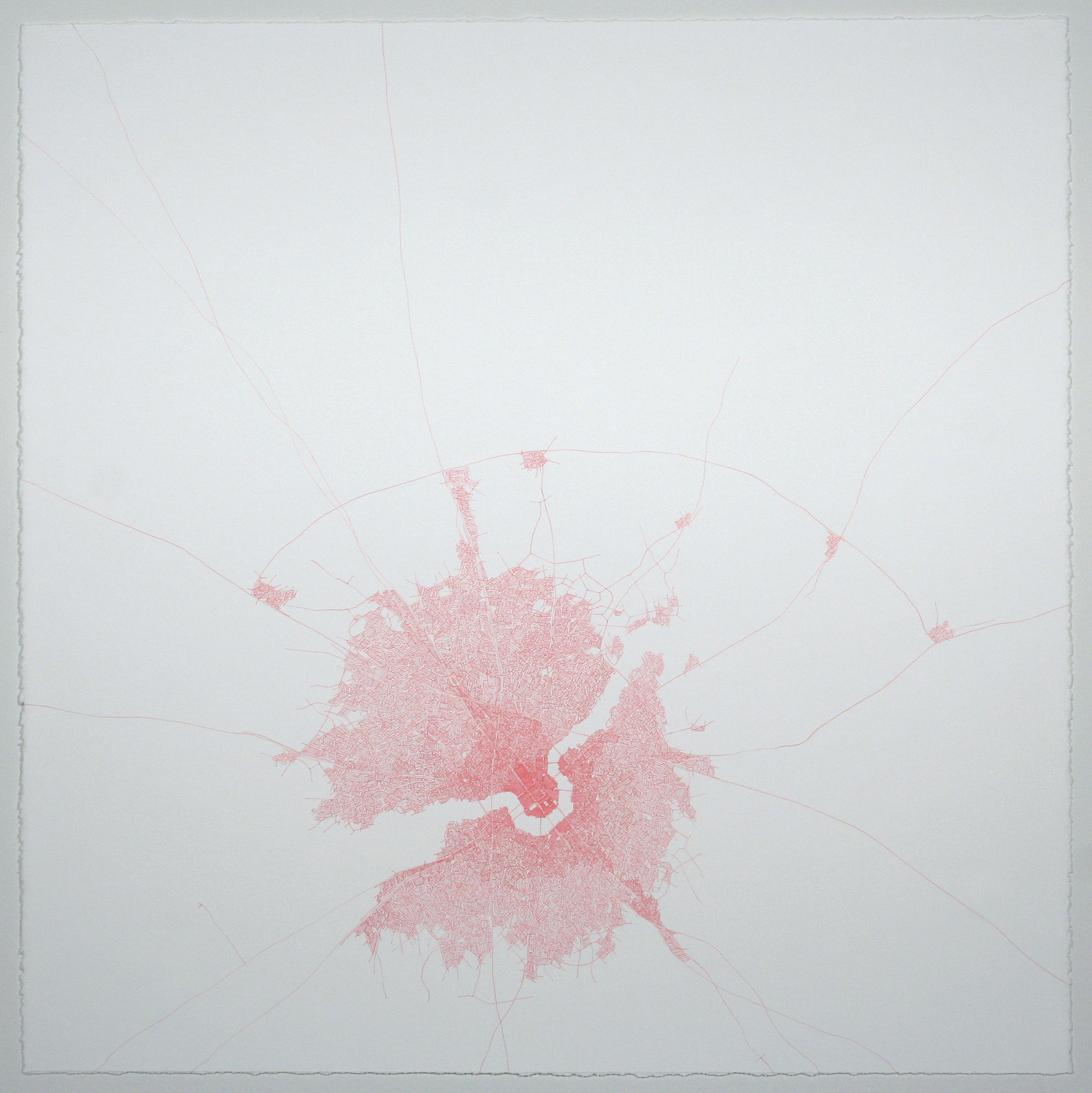 Ontology is a central theme throughout my work because it deals with the nature of existence or being by analyzing concepts about location, time, space, and identity. Geology, geography and especially cartography provide me with useful languages to manipulate and transform these ontological concepts into visual metaphors. These metaphors are often used to convey ideas, feelings or emotions about a place, process, movement, perception or state of being. Each Ontological Road Map is not only a finished work that represents a fictional place, but it is also a reflection of the hand of the artist, the act of making lines. Each of these drawings involves a labor-intensive process where much time is needed for construction and development. Once the drawing is complete, it is a picture of time. That is, each drawing reveals the time it takes to make a road map and then each finished drawing actually represents that time. All along, there is a literal play on mapping. Each drawing represents a process (of mapmaking, of creating roads) and a place (a representation of existence that can be either real or imagined).