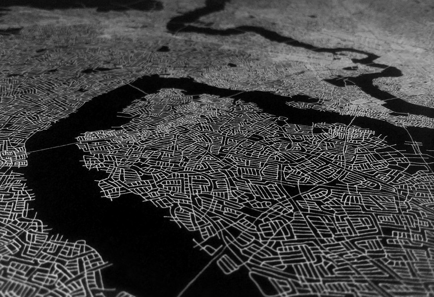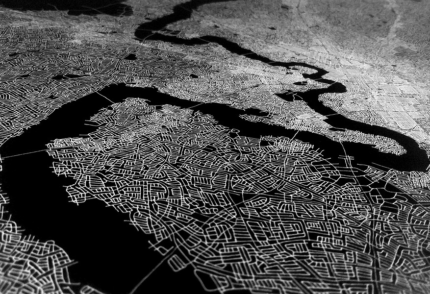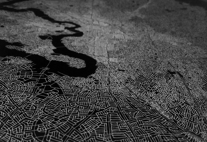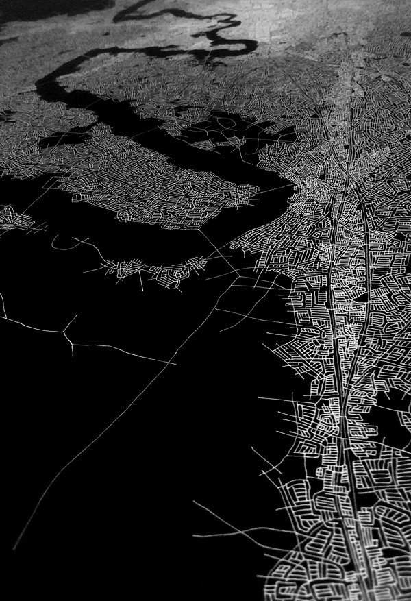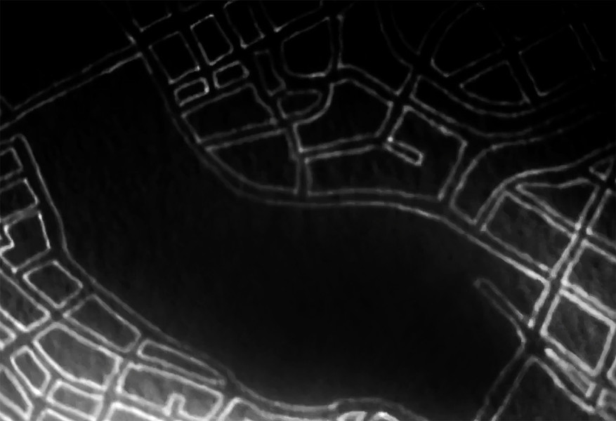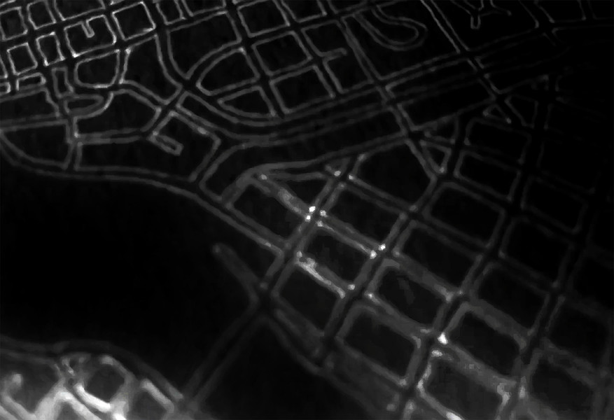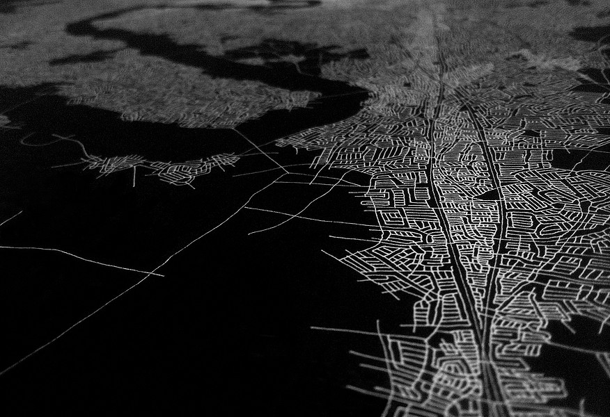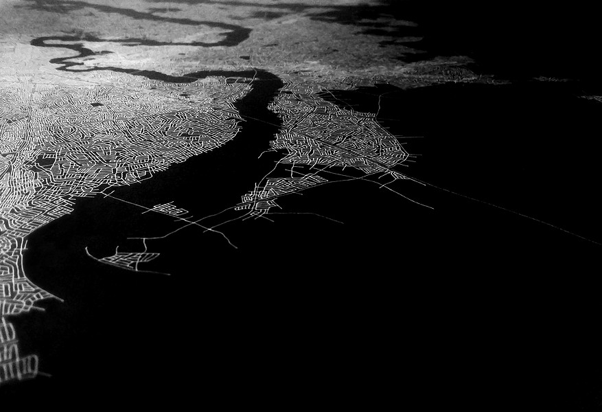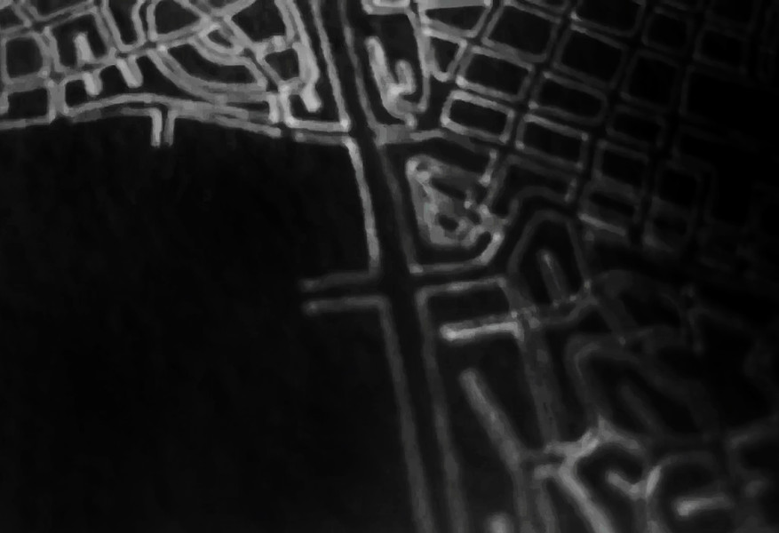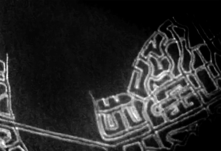 These photographs and video stills are a more contemporary and technology driven variation on my earlier Ontological Surveillance Map series, which uses blown up painted detail images of the map drawing to mimic the “insets” of traditional cartography. This body of work mimics the surveillance video taken by security cameras, police departments and the military. They are a simulacra of observations of a fictional landscape that could be a depiction of a real physical exterior space but also a psychological interior space.