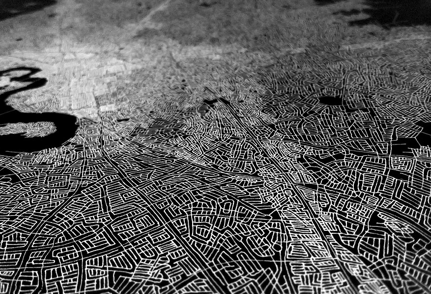 The Ontological Surveillance Drone photo series began accidentally in 2013 when I stopped drawing one day and took a series of still photographs of my Ontological Road Map ink drawing that was lying flat on my table. In 2020 during the Covid-19 lockdown I had no access to my studio I worked on mechanical pencil drawings in my Plan series at home and took a video “fly-over” of the drawing. This became the initial video of the Ontological Surveillance Drone video series.