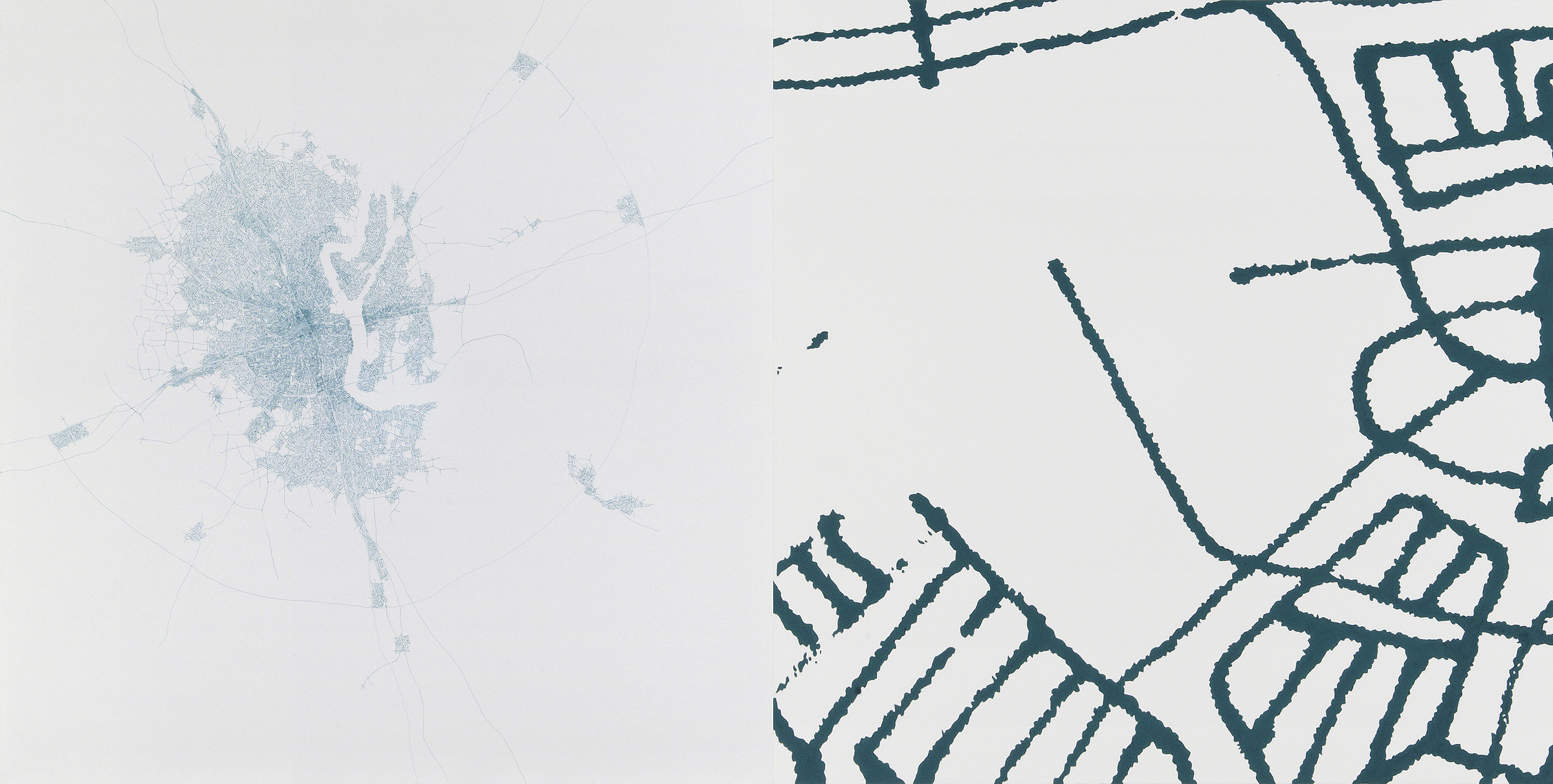 Like the Ontological Road Maps the Surveillance Maps begin with the order and structure of a New World city grid and gradually "build" outward into the convoluted confusion of the urban sprawl of twenty-first century cities in the United States. The Surveillance Maps consist of two panels. One panel an Ontological Road Map (ink on paper) and the other panel is a painting (gouache on paper) of a projected digital detail photograph of the road map. These two panels are then juxtaposed, resulting in the completed diptych. These pieces are an alteration of a  traditional cartographic convention of an “inset”, which is “a small graphic representation (such as a map or picture) set within a larger one.” However, an inset is also “a place where something flows in.”
