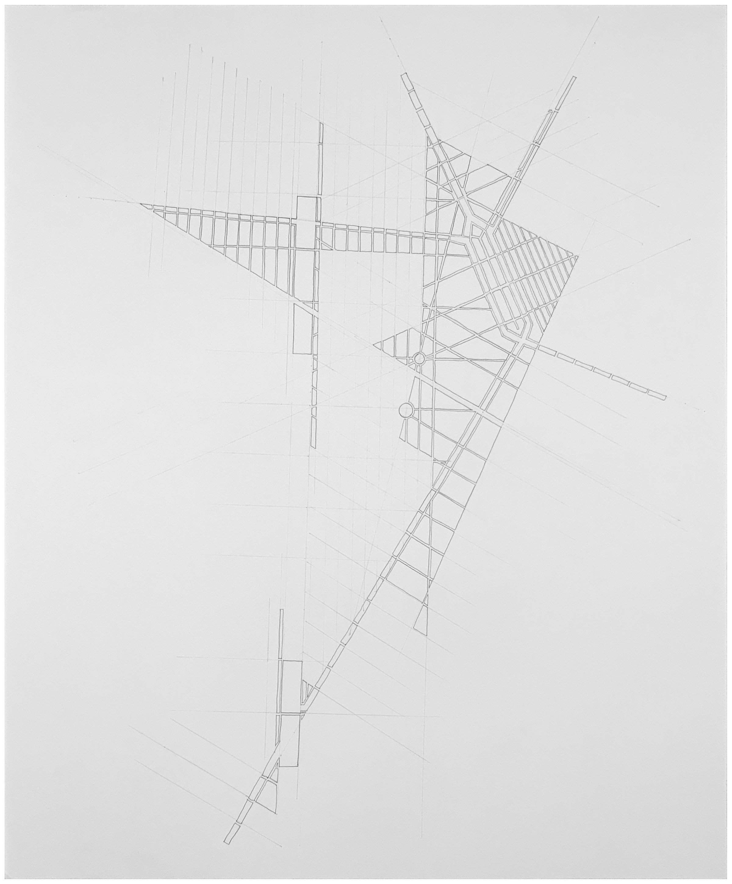 Influenced by maps from art history books of ancient settlements and the drawings and observations in Edmund N. Bacon’s Design of Cities the Plans series of fictional neighborhoods developed from a sketchbook made during a period where my time working in the studio was limited. The drawings necessarily needed to be faster and less obsessively detailed than the other drawing series I have been engage in making for the last 18 years. Simply put, the Plans series uses a cartographic-like vernacular as a compositional language. There are only a couple of rules that I generally follow but other than those each drawing is an organic process of action and reaction that begins at a random point on the paper.