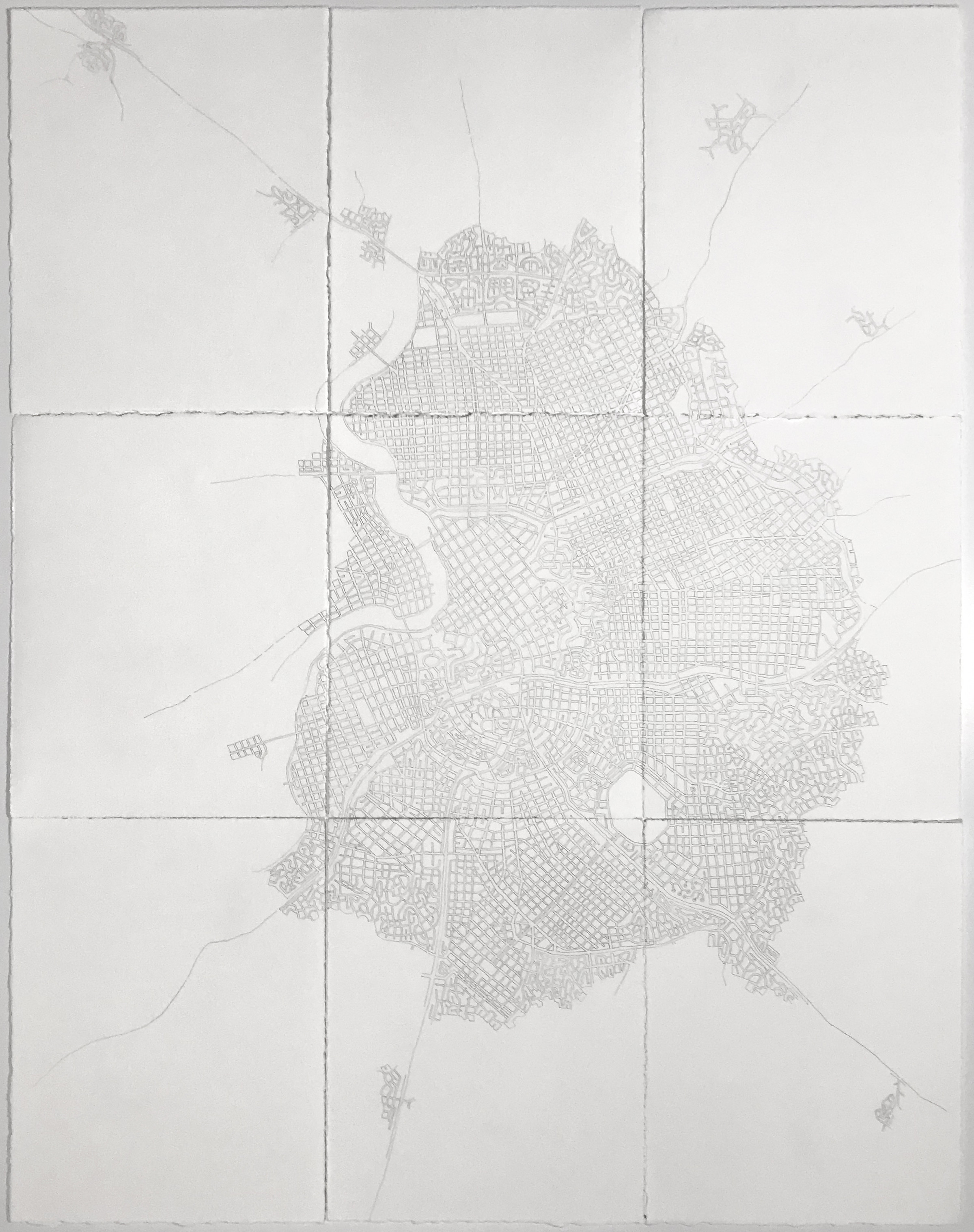 Influenced by maps from art history books of ancient settlements and the drawings and observations in Edmund N. Bacon’s Design of Cities the Plans series of fictional neighborhoods developed from a sketchbook made during a period where my time working in the studio was limited. The drawings necessarily needed to be faster and less obsessively detailed than the other drawing series I have been engage in making for the last 18 years. Simply put, the Plans series uses a cartographic-like vernacular as a compositional language. There are only a couple of rules that I generally follow but other than those each drawing is an organic process of action and reaction that begins at a random point on the paper.