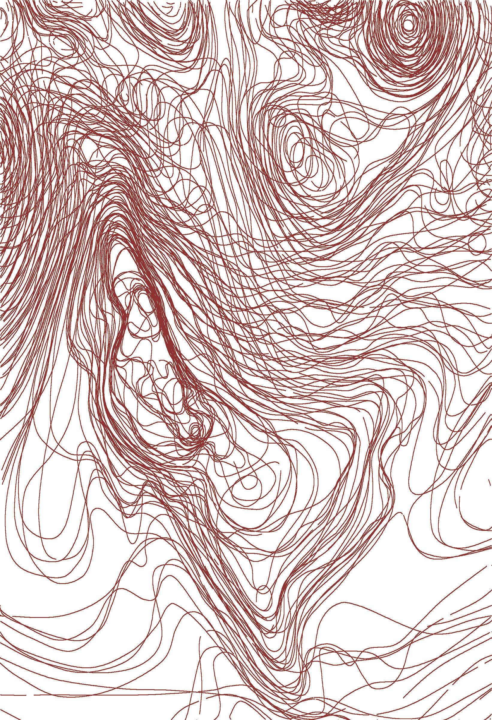 Surface Analysis maps are made by the National Oceanic and Atmospheric Administration (NOAA) which detail surface conditions of North America. These maps are published every three hours of every day. I downloaded high resolution maps from the NOAA website and reduced the images to just the isobar lines and then layered the eight maps published each day. The titles and color of the lines are taken from each map.