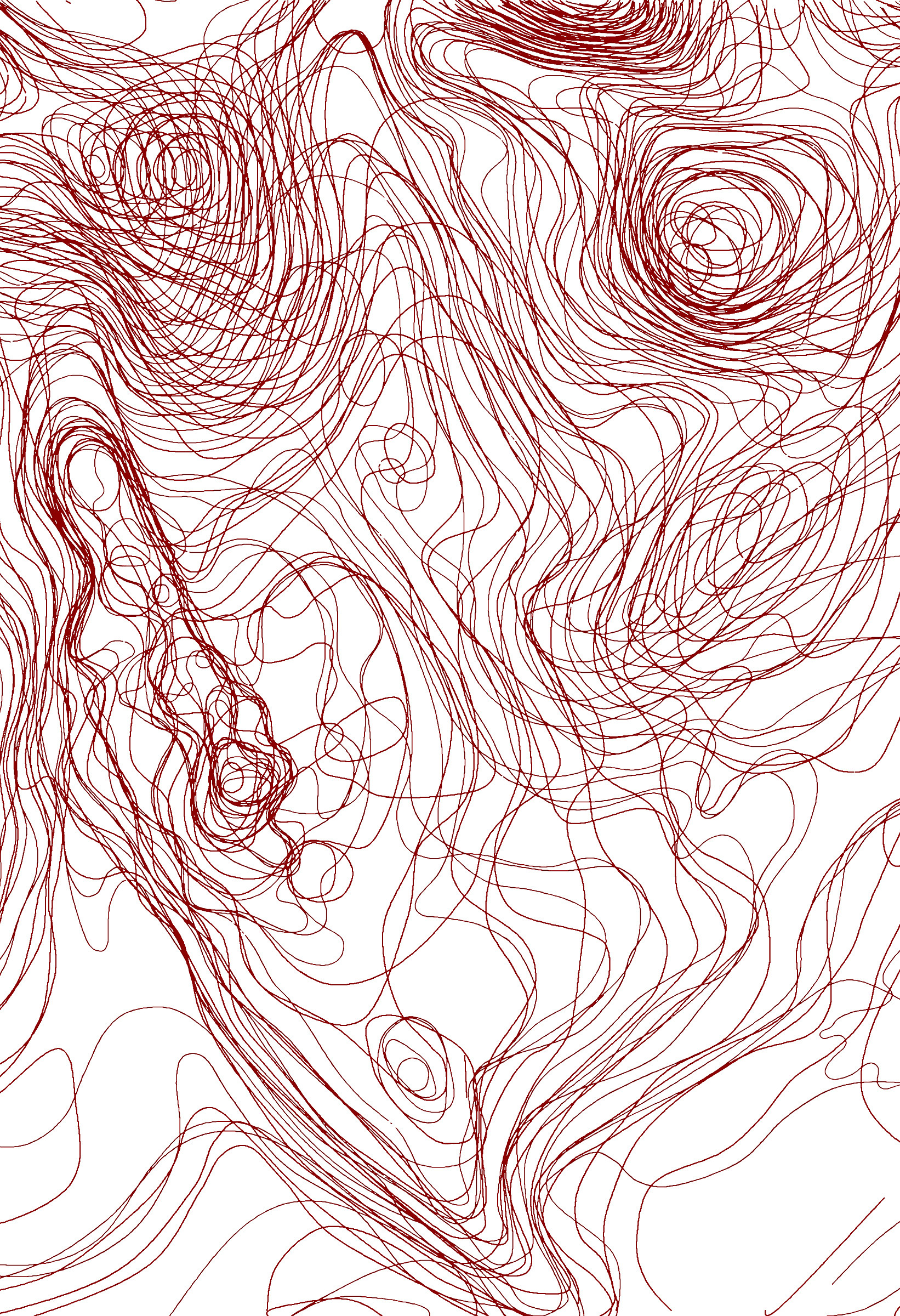 Surface Analysis maps are made by the National Oceanic and Atmospheric Administration (NOAA) which detail surface conditions of North America. These maps are published every three hours of every day. I downloaded high resolution maps from the NOAA website and reduced the images to just the isobar lines and then layered the eight maps published each day. The titles and color of the lines are taken from each map.
